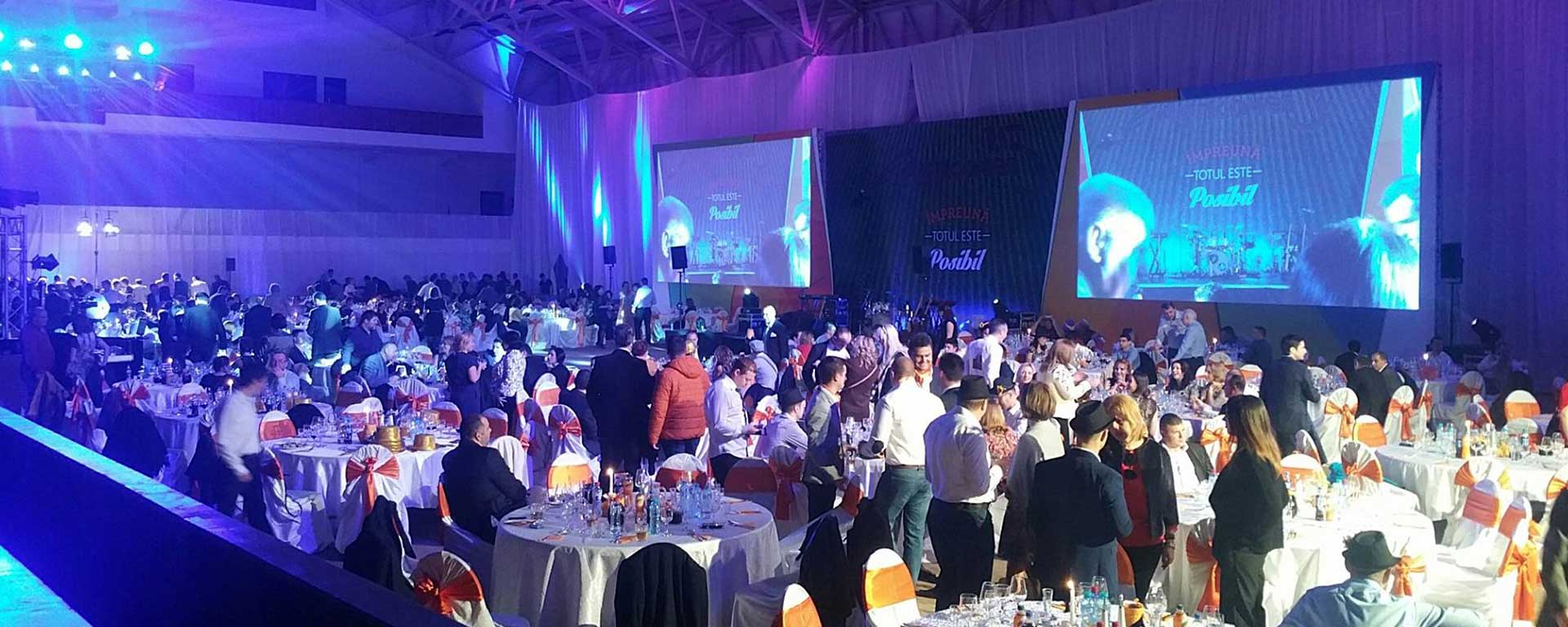 La final de Noiembrie 2015 am organizat logistica de catering a unuia dintre cele mai mari evenimente corporate care au avut loc recent la Cheile Gradistei Fundata. Aproximativ 450 de persoane au ocupat intreaga capacitate de cazare a complexului. Super sala de evenimente, tranformata in doar o ora din sala de conferinte in sala pentru cina festiva.